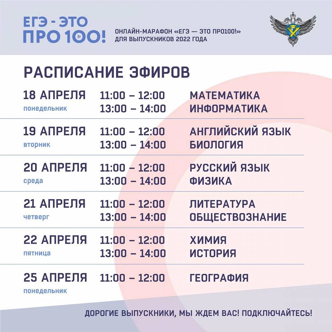 Друзья! Уже скоро стартует онлайн-марафон «ЕГЭ – это про100!» для помощи выпускникам к единым госэкзаменам.С 18 по 25 апреля ежедневно будут проводиться онлайн-трансляции, посвященные подготовке к ЕГЭ по основным предметам.